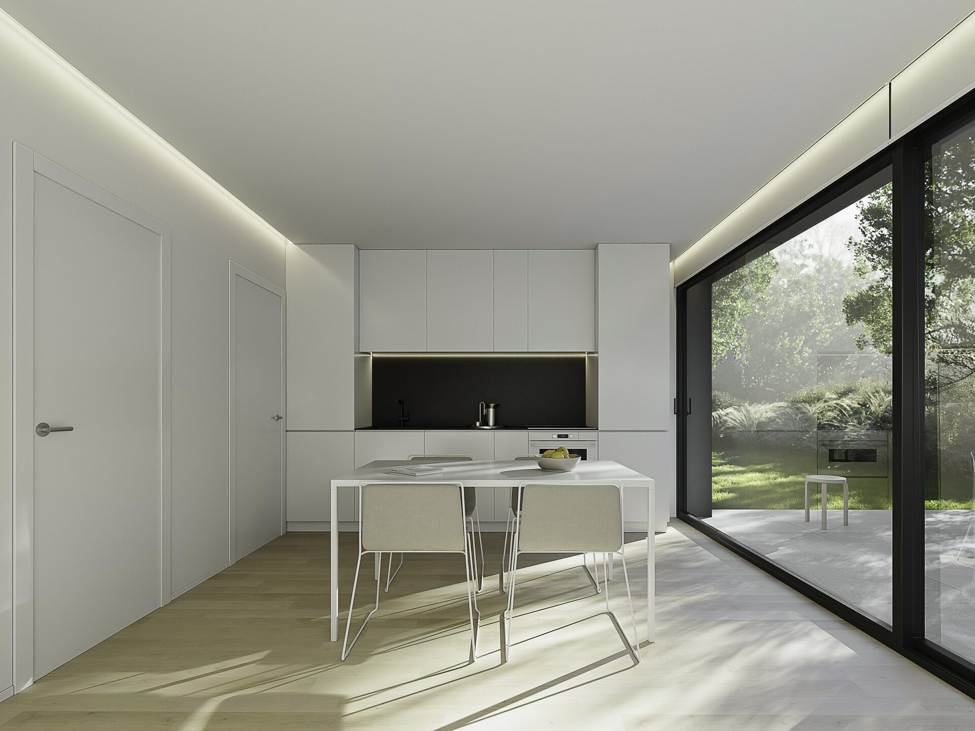 The interior of these independent homes in Alfaz del Pi is designed with attention to detail and functionality. The villas feature two bedrooms and one bathroom, offering a cozy and well-distributed space. The wooden flooring adds warmth and elegance to each room, while the integrated appliances make daily life easier. Built-in wardrobes optimize storage space, maintaining order and aesthetics. Additionally, each home is equipped with a video intercom, adding an extra level of security and convenience for residents.