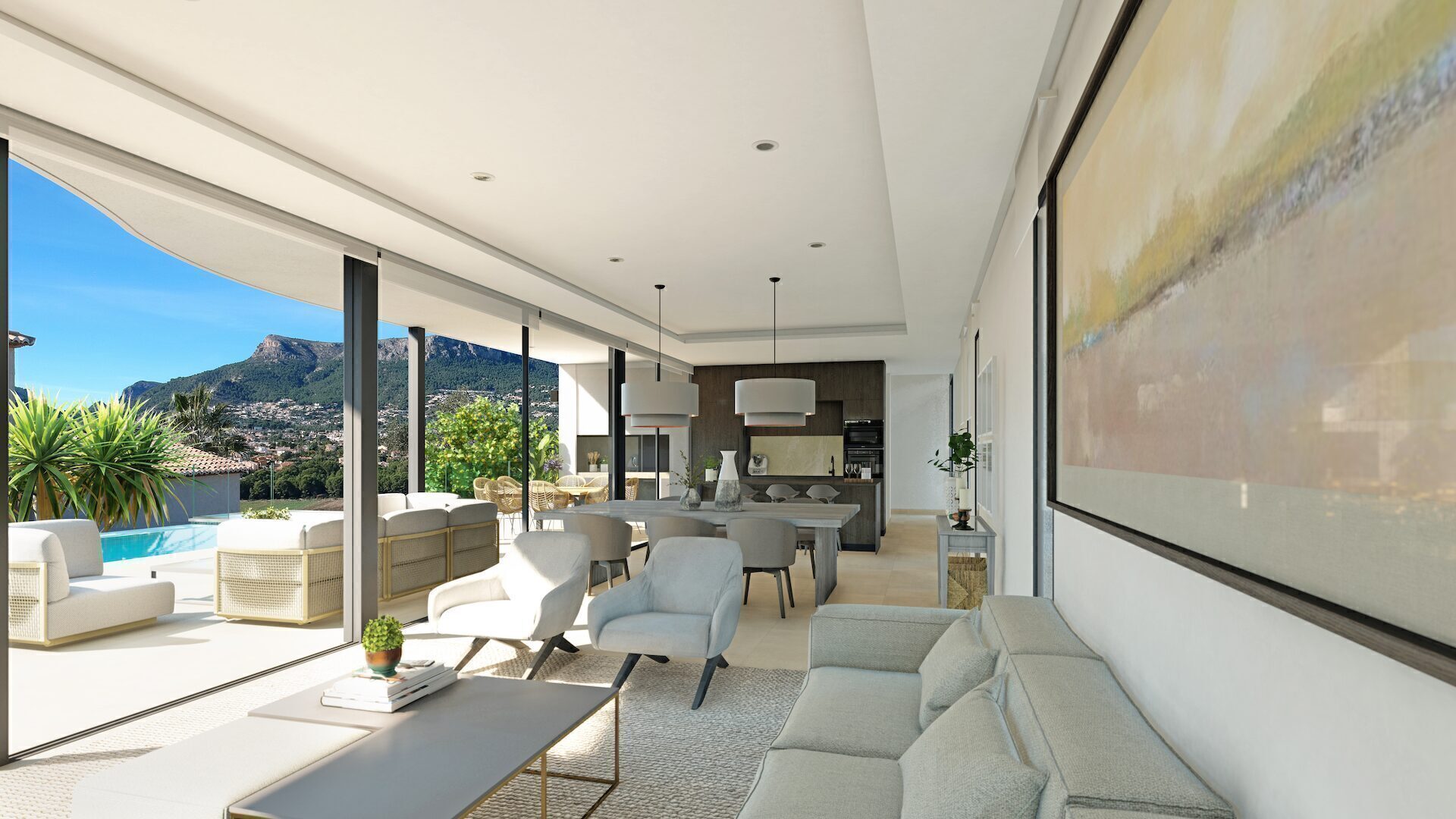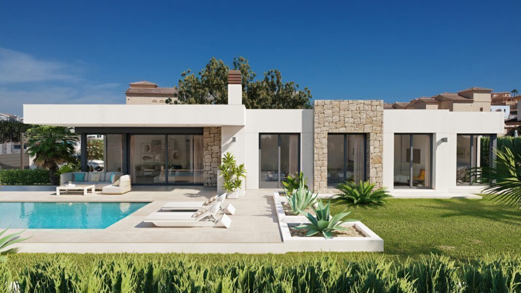 The interior of these detached homes in Calpe is designed with a focus on quality and comfort. Porcelain tile floors add a touch of elegance and are easy to maintain. Climate control is ensured thanks to the air conditioning system, guaranteeing a pleasant temperature throughout the year. Electric shutters and the video intercom add an extra level of convenience and security. Built-in wardrobes in the bedrooms offer efficient storage, keeping spaces tidy and clutter-free. The layout of the homes, with options of 3 or 4 bedrooms and 2 to 4 bathrooms, is designed to adapt to the needs of each family, providing spacious and well-lit areas.