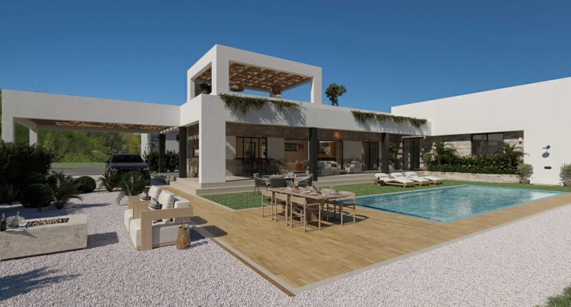 The exterior of the villa is designed to fully enjoy the Mediterranean climate. It features a private garden that offers an ideal green space for relaxation or outdoor activities. The terrace is perfect for al fresco dining or simply enjoying a quiet afternoon. Additionally, the villa includes a pergola that provides shade and a cozy atmosphere. The private pool is a true luxury, allowing for refreshing dips on the hottest days and offering additional space for entertainment.