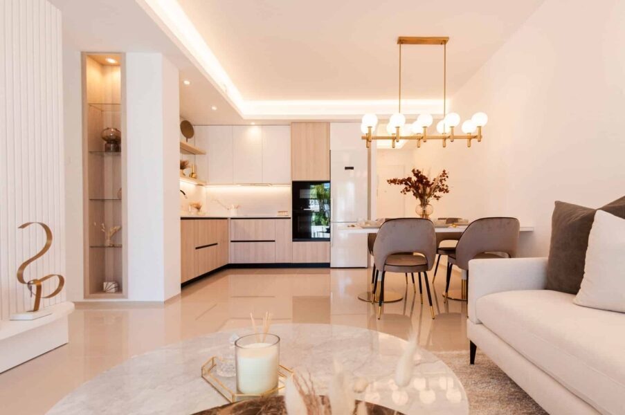 The exteriors of these properties are designed to offer an outdoor living space that complements the interior of the homes. Each property features a private garden, perfect for enjoying the Mediterranean climate. Additionally, the terraces provide extra space to relax or entertain guests. The inclusion of a solarium in the homes allows for panoramic views and maximizes sun exposure throughout the year. The pergola is an additional element that provides shade and style, creating a cozy atmosphere for outdoor enjoyment.