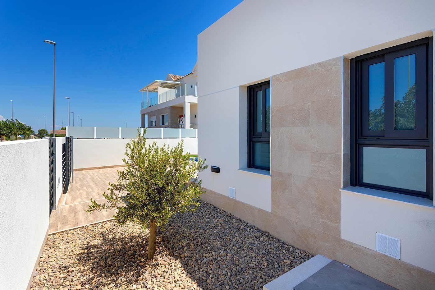 Newly built villas on one level in the new part of Daya Nueva. Only a few minutes walk to the centre of the village. The property consists of 3 bedrooms, 2 bathrooms and a private pool of 18m2. Living/dining room with double height ceiling, open plan kitchen, natural light and option for solarium. The master bedroom has walk in wardrobe option and en suite bathrooms.