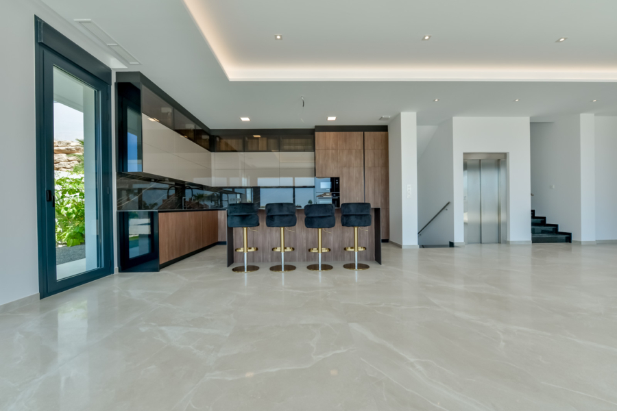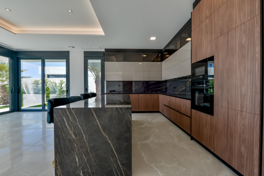 The interior of the villas in Golf Bahía is designed to offer maximum comfort and functionality. Ceramic floors add a modern and elegant touch to each room. The villas are equipped with high-quality appliances, ensuring that the kitchen and other areas of the home are practical and efficient. Integrated home automation allows full control of home functions, from lighting to climate control, enhancing daily comfort. Electric blinds offer easy control of natural light and privacy. Built-in wardrobes in the bedrooms provide ample storage space, maintaining order and organization in the home.