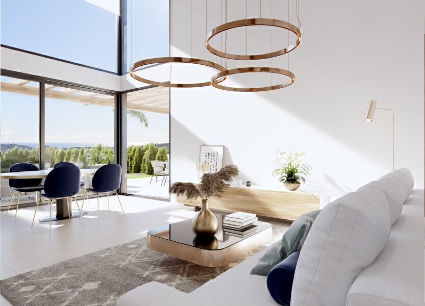 The interiors of these homes in Finestrat are carefully designed to offer maximum comfort and functionality. Layout options include properties with 3 or 4 bedrooms and 3 or 4 bathrooms, adapting to the needs of each family. Ceramic floors provide a modern touch and are easy to maintain. The homes are equipped with air conditioning and smart home technology, allowing for efficient home control. Electric shutters and high-quality appliances complete a set of features that ensure a comfortable and modern living experience. Built-in wardrobes offer additional storage space, maintaining the home’s order and aesthetics.