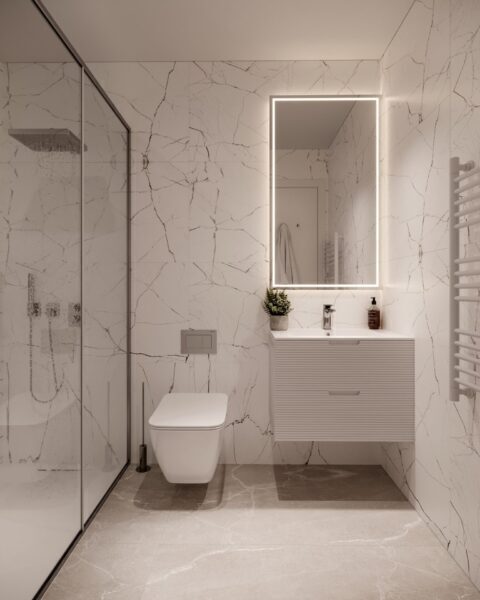 The interior of these homes is designed to offer a cozy and functional environment. Distribution options include homes with 2 and 3 bedrooms, all with 2 bathrooms, making them ideal for both families and couples. High-quality finishes, such as porcelain floors and integrated appliances, ensure a modern and elegant environment. Built-in wardrobes provide efficient storage, while electric shutters and video intercom add a touch of comfort and security to each home.