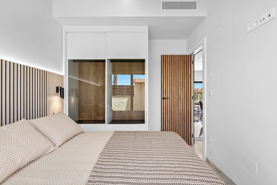 The exteriors of these detached homes in Algorfa are designed to make the most of the Mediterranean climate. Each property features its own private pool, ideal for cooling off during the warm summer days. Additionally, the spacious terraces and solariums offer perfect spaces for relaxation or outdoor gatherings. The presence of pergolas adds a touch of elegance and functionality, providing shade and a cozy place to rest. The gardens, where applicable, are designed to complement the natural surroundings, offering a private green space for each home.