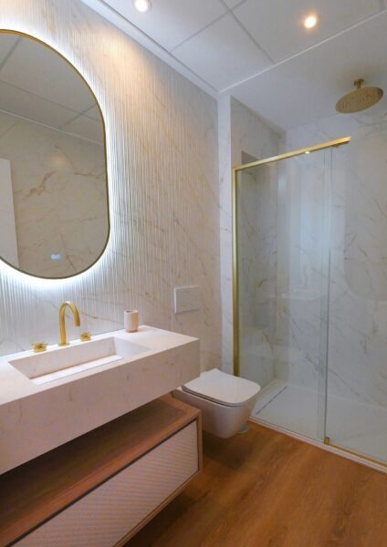 The interior design of the homes in this residential complex in La Manga is crafted to offer maximum comfort and functionality. The available apartments and penthouses feature layouts that include options of 1, 2, and 3 bedrooms, as well as 1, 2, and 3 bathrooms, catering to the needs of different family types. Porcelain tile floors add a modern and elegant touch, while integrated appliances ensure a comfortable and efficient living experience. Built-in wardrobes are designed to optimize space, providing practical and aesthetic storage solutions. Every detail has been carefully considered to create a welcoming and sophisticated environment.