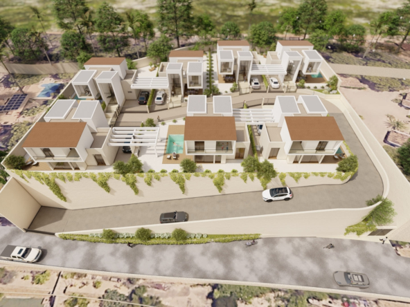 The interiors of the homes are carefully designed to offer maximum comfort and functionality. With options of 3 and 4 bedrooms and 3 bathrooms, each home adapts to the needs of modern families. Wooden floors add warmth and elegance, while air conditioning ensures a pleasant environment year-round. The kitchens are equipped with high-quality appliances, and built-in wardrobes offer efficient and discreet storage. The layout includes a private garage, ensuring convenience and security for residents.