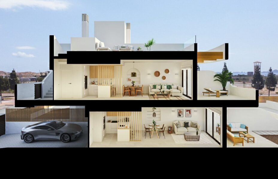 The exteriors of this residential complex in Los Alcázares are designed to offer a relaxing and attractive living environment. Each property features a private garden, perfect for enjoying the Mediterranean climate and outdoor moments. Terraces, present in all types, provide additional space for leisure and relaxation, allowing enjoyment of the sea views and natural surroundings. Additionally, solariums available in some properties offer an exclusive space for sunbathing and relaxing in complete privacy. The location just 1 km from the sea and the golf course adds significant value, allowing residents to enjoy outdoor activities and the beauty of the coastal landscape. The architecture of the complex harmoniously integrates with the environment, creating a space that invites tranquility and enjoyment of nature.