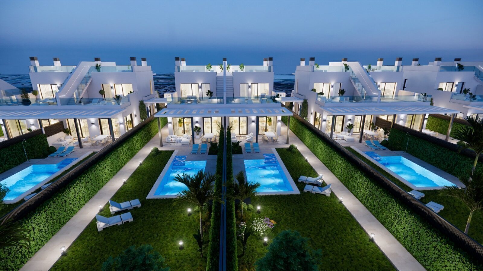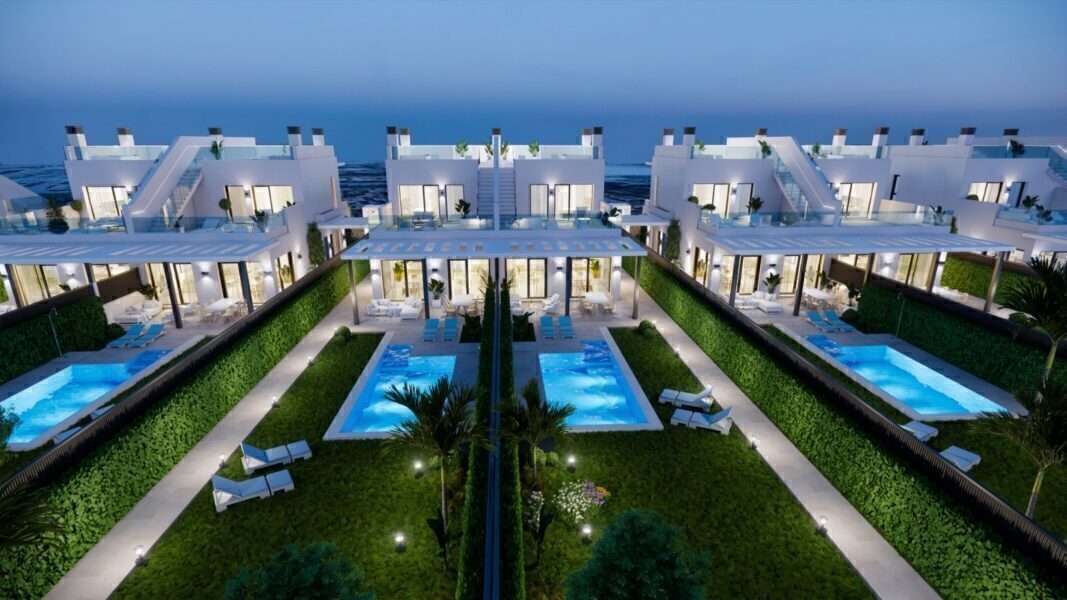 The exteriors of these townhouses are designed to offer an exceptional outdoor lifestyle. Each property includes a private garden, ideal for enjoying moments of relaxation or outdoor activities. Additionally, they feature a terrace and a solarium, perfect for taking advantage of the region’s sunny climate. The inclusion of a private pool in each townhouse provides an exclusive space to cool off and enjoy the summer in total privacy.