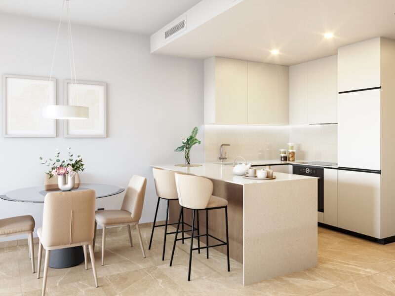 The exteriors of these homes are designed to maximize comfort and enjoyment of the Mediterranean climate. All properties feature terraces, ideal for relaxing outdoors and enjoying the views. The ground floors offer direct access to the garden areas, while the penthouses have private solariums, perfect for sunbathing in complete privacy. The community is surrounded by well-maintained gardens, providing a green and serene environment for all residents.