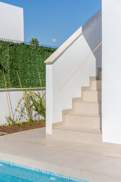 The homes feature an attractive outdoor space that includes a private garden, perfect for enjoying the Mediterranean climate. Each property has a private pool, ideal for cooling off on hot days and enjoying leisure time with family or friends. Additionally, the terraces offer extra space for outdoor relaxation, while the solarium provides an exclusive place to sunbathe in complete privacy. The exterior design is intended to maximize enjoyment of the natural surroundings and offer a tranquil and comfortable atmosphere.