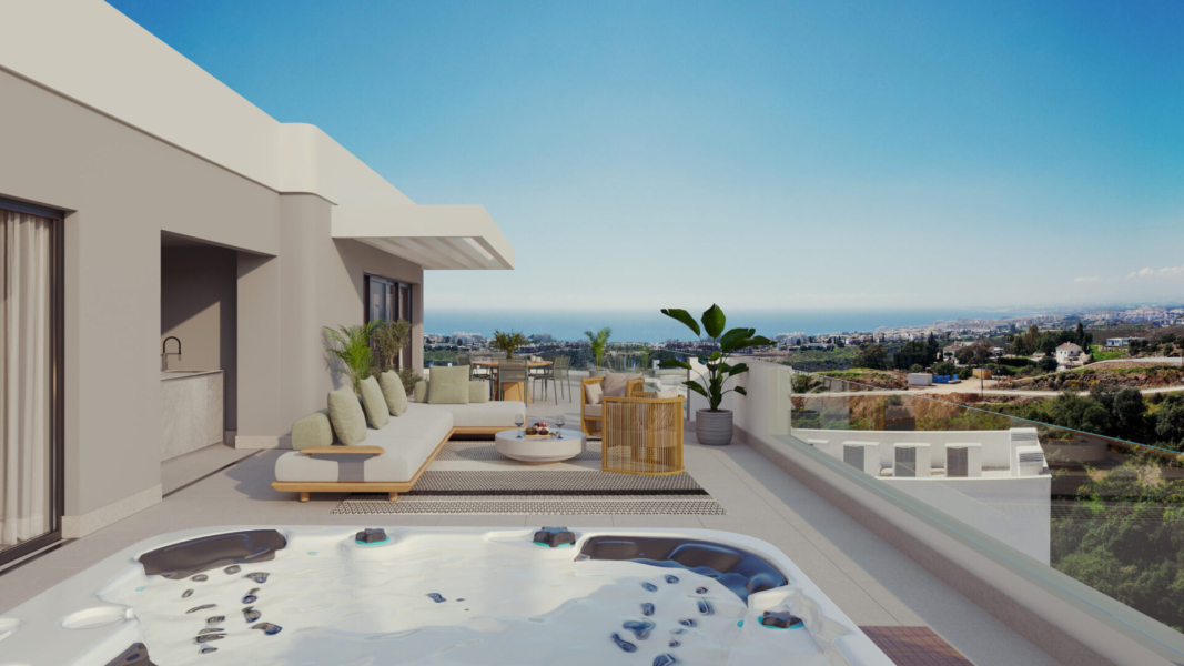 Discover a modern residential development featuring 57 exclusive homes designed for privacy, comfort, and tranquility. This collection includes one-, two-, and three-bedroom properties, all showcasing large terraces, bright interiors, high-end finishes, and impeccable layouts. Notably, all penthouses come equipped with hot tubs, and select ground floor units also have this feature.