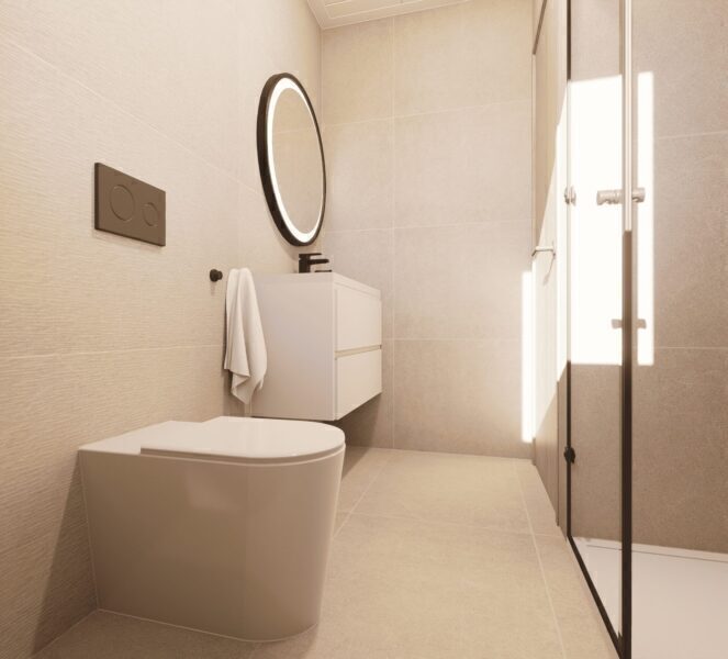 The interior of the bungalows is designed with a focus on quality and comfort. Porcelain stoneware floors add a modern and elegant touch, while electric shutters provide an additional level of convenience. All homes are equipped with appliances, making daily life easier from day one. Air conditioning ensures a pleasant environment throughout the year, and built-in wardrobes offer efficient storage space. The layout includes three bedrooms and two bathrooms, providing ample and functional space for families or couples.