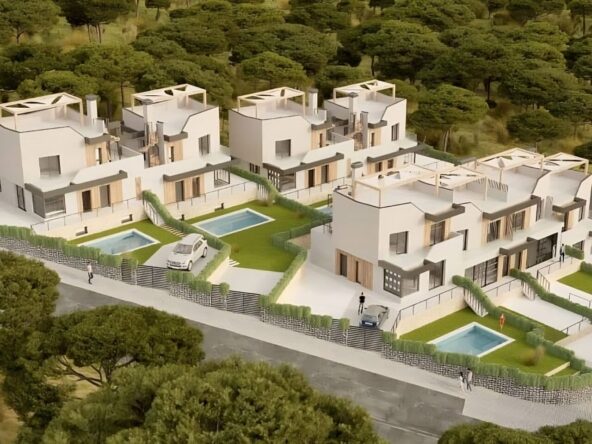 Inside, the homes are equipped with porcelain tile floors that add a touch of elegance and durability. The electric shutters and included appliances make daily life easier, while the built-in wardrobes offer efficient and discreet storage. The pre-installation of air conditioning ensures the home stays cool during the warmer months. The layout of the homes, with three bedrooms and three bathrooms, is designed to maximize comfort and functionality, allowing for harmonious and comfortable living for all family members.