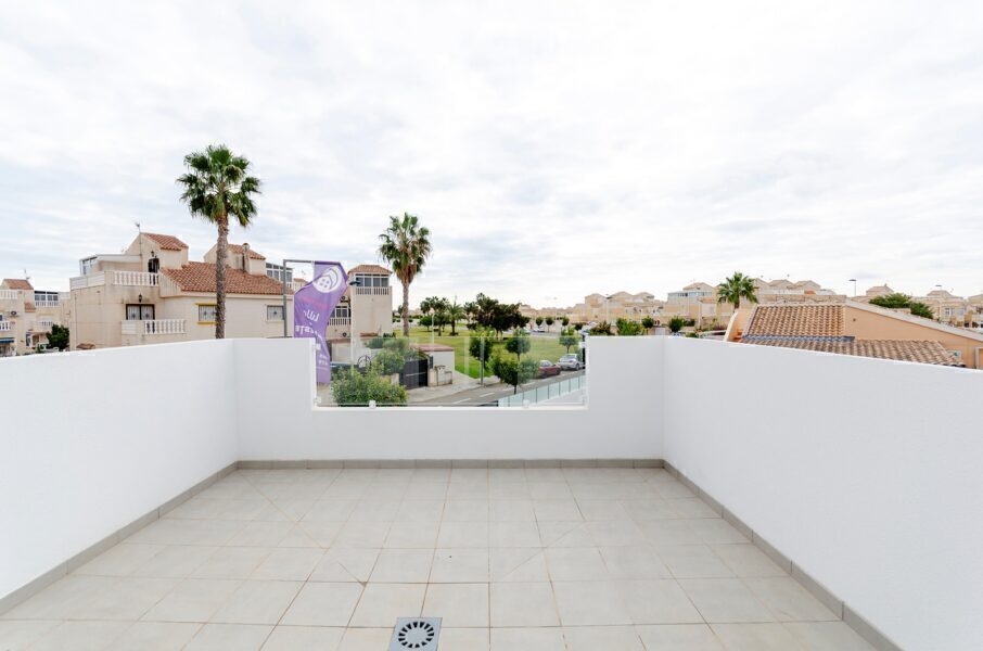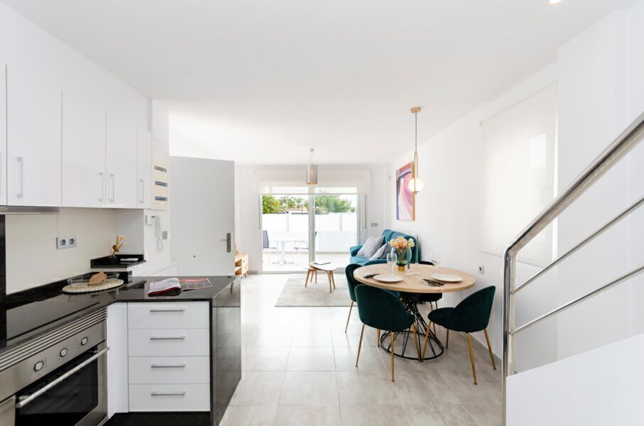 The exteriors of these townhouses in Torrevieja are designed to maximize enjoyment of the Mediterranean climate. Each home features a private terrace, perfect for relaxing outdoors or enjoying family meals. Additionally, there is the option to include a solarium, ideal for those who want additional space for sunbathing or creating a personalized relaxation area. The presence of a private pool in each townhouse adds a touch of luxury and exclusivity, allowing you to cool off on the hottest days without leaving home. The electric shutters installed on the exterior windows offer convenience and security, allowing easy adjustment of light entry.